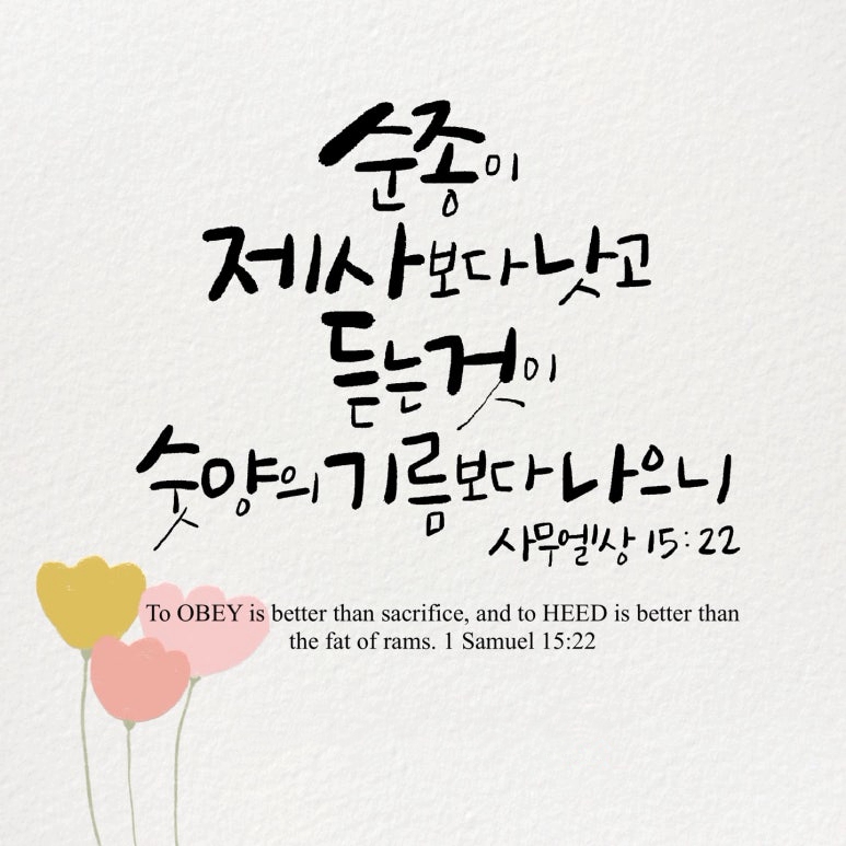 "사무엘이 이르되 여호와께서 번제와 다른 제사를 그의 목소리를 청종하는 것을 좋아하심 같이 좋아하시겠나이까 순종이 제사보다 낫고 듣는 것이 숫양의 기름보다 나으니"