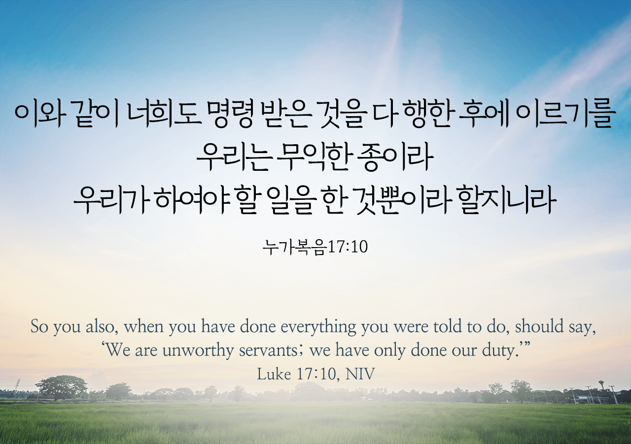 “이와 같이 너희도 명령 받은 것을 다 행한 후에 이르기를 우리는 무익한 종이라 우리가 하여야 할 일을 한 것뿐이라 할지니라.”
