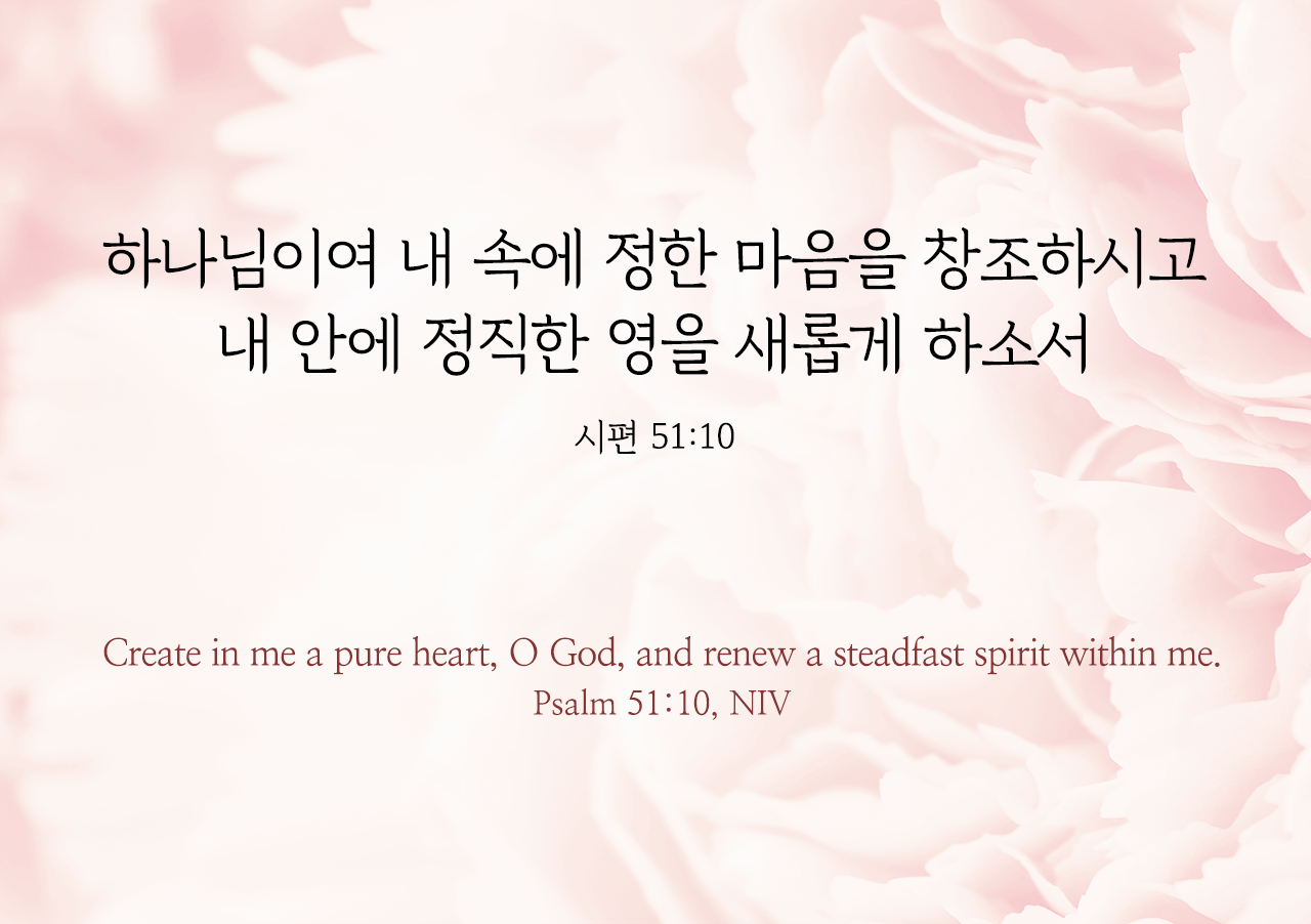 "하나님이여 내 속에 정한 마음을 창조하시고 내 안에 정직한 영을 새롭게 하소서"