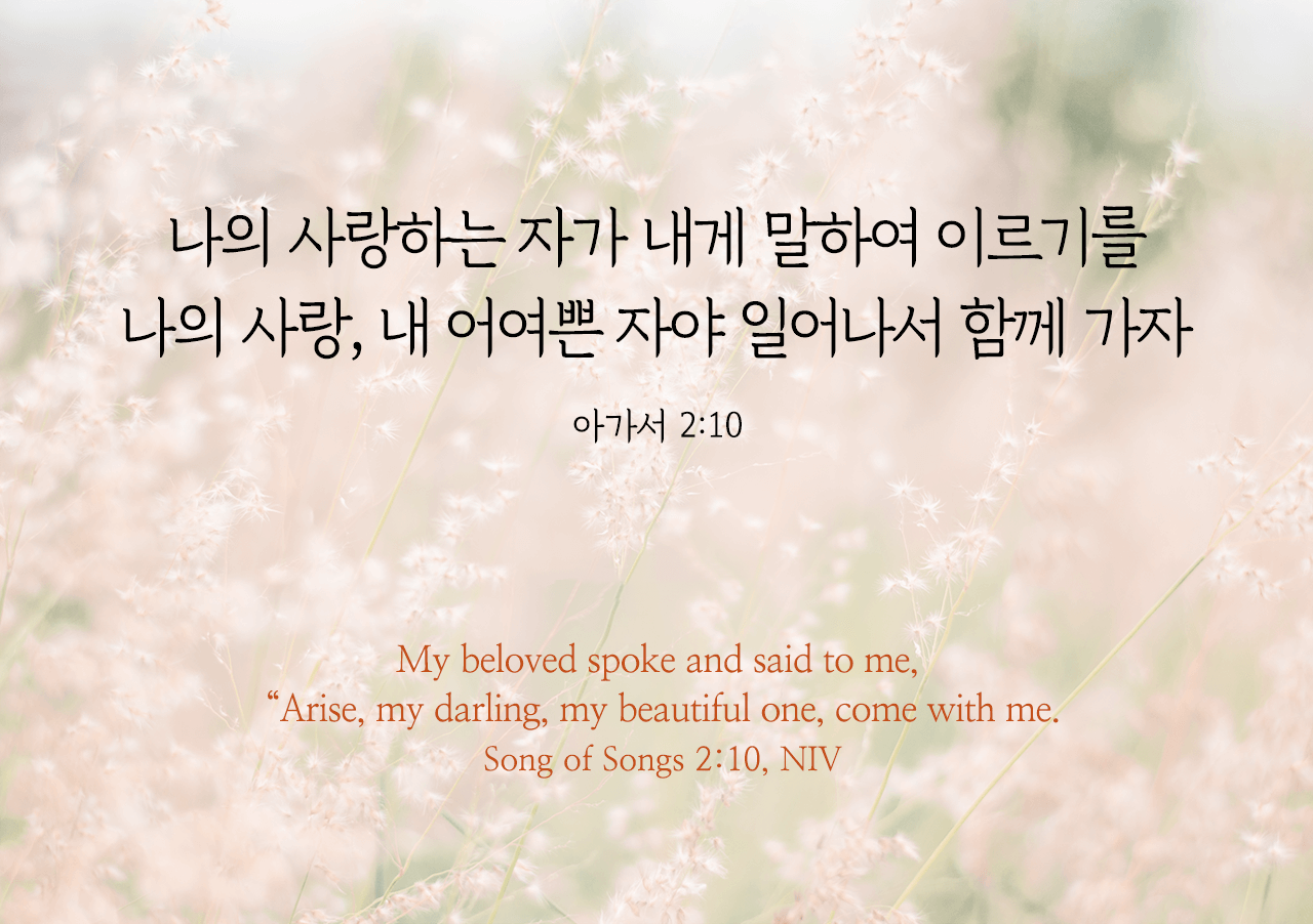 "나의 사랑하는 자가 내게 말하여 이르기를 나의 사랑, 내 어여쁜 자야 일어나서 함께 가자"