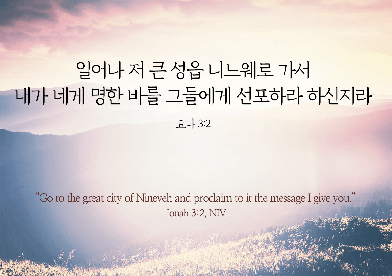 "일어나 저 큰 성읍 니느웨로 가서 내가 네게 명한 바를 그들에게 선포하라 하신지라"