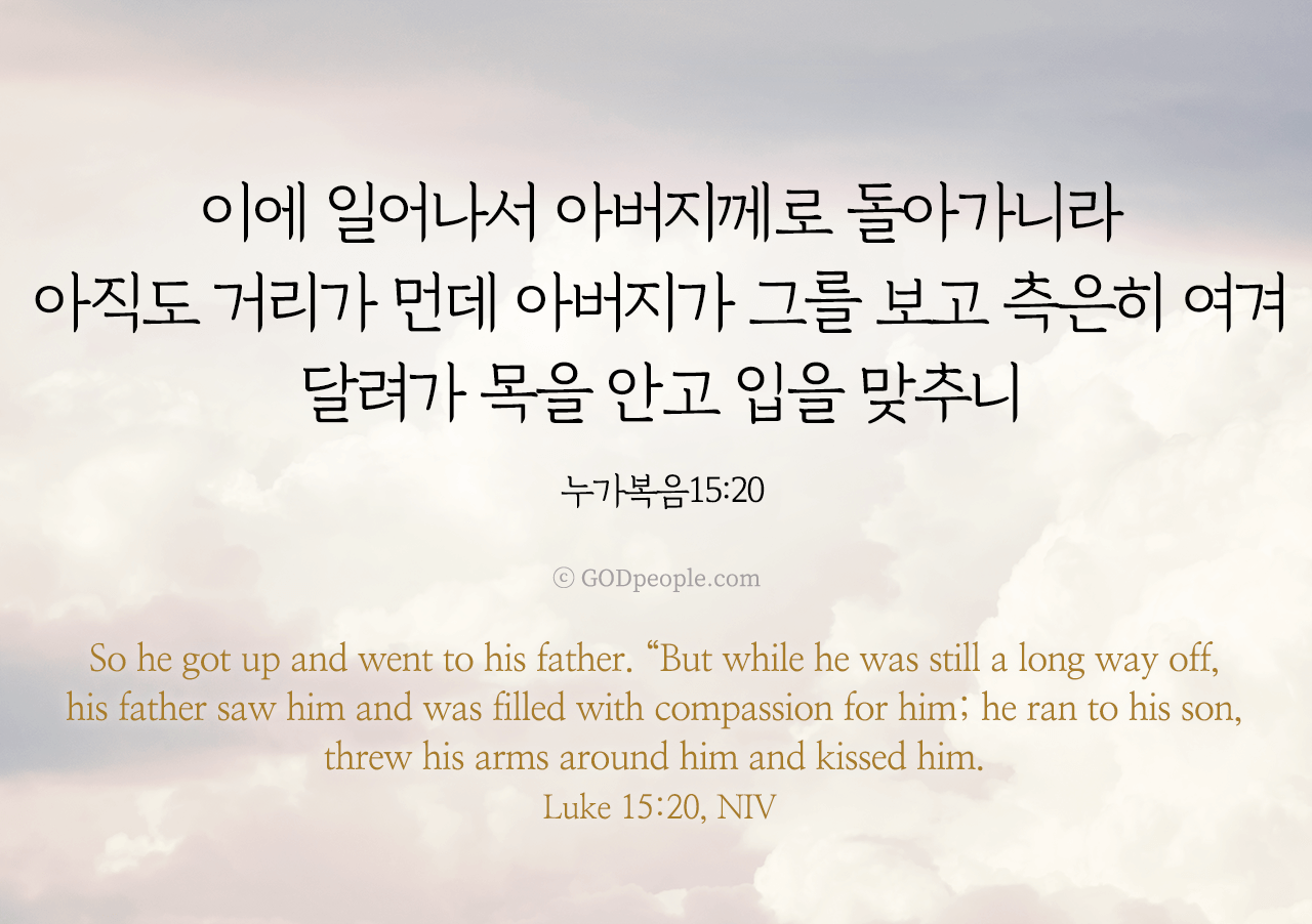 "이에 일어나서 아버지께로 돌아가니라 아직도 거리가 먼데 아버지가 그를 보고 측은히 여겨 달려가 목을 안고 입을 맞추니"