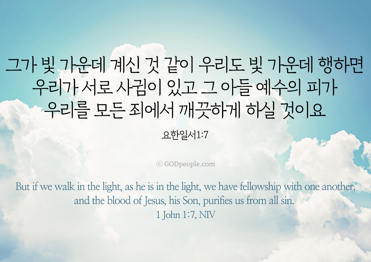 "그가 빛 가운데 계신 것 같이 우리도 빛 가운데 행하면 우리가 서로 사귐이 있고 그 아들 예수의 피가 우리를 모든 죄에서 깨끗하게 하실 것이요"