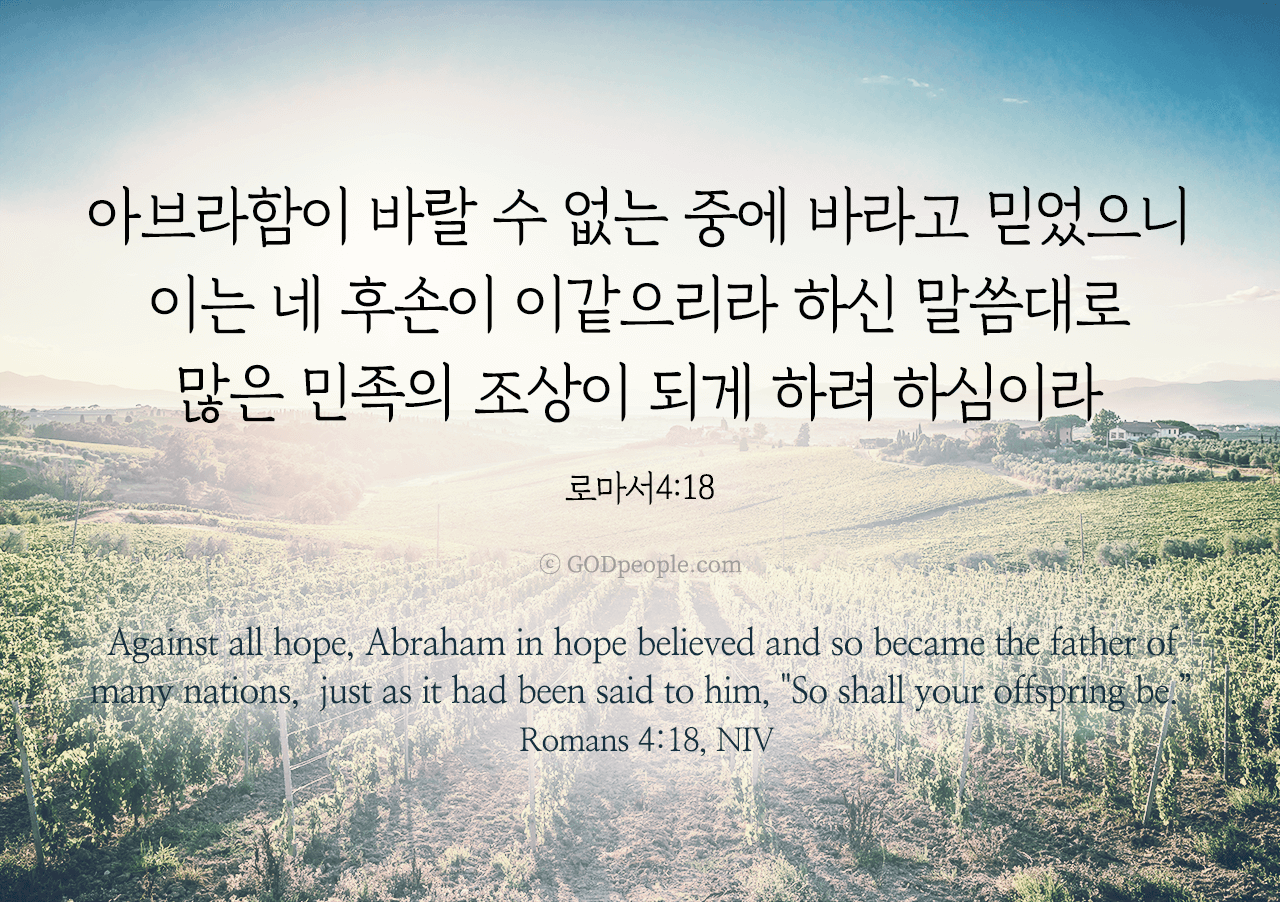 "아브라함이 바랄 수 없는 중에 바라고 믿었으니 이는 네 후손이 이같으리라 하신 말씀대로 많은 민족의 조상이 되게 하려 하심이라"