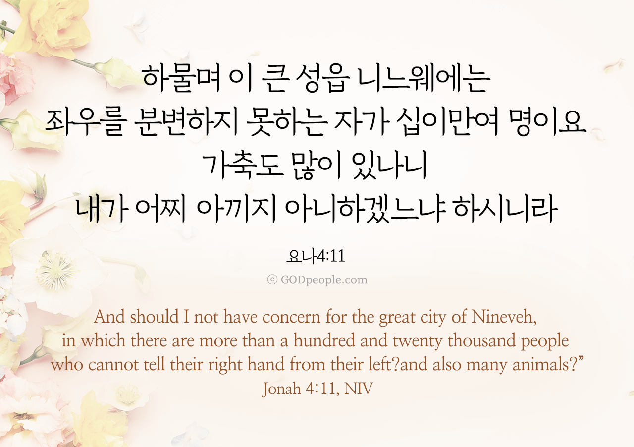 "하물며 이 큰 성읍 니느웨에는 좌우를 분변하지 못하는 자가 십이만여 명이요 가축도 많이 있나니 내가 어찌 아끼지 아니하겠느냐 하시니라"