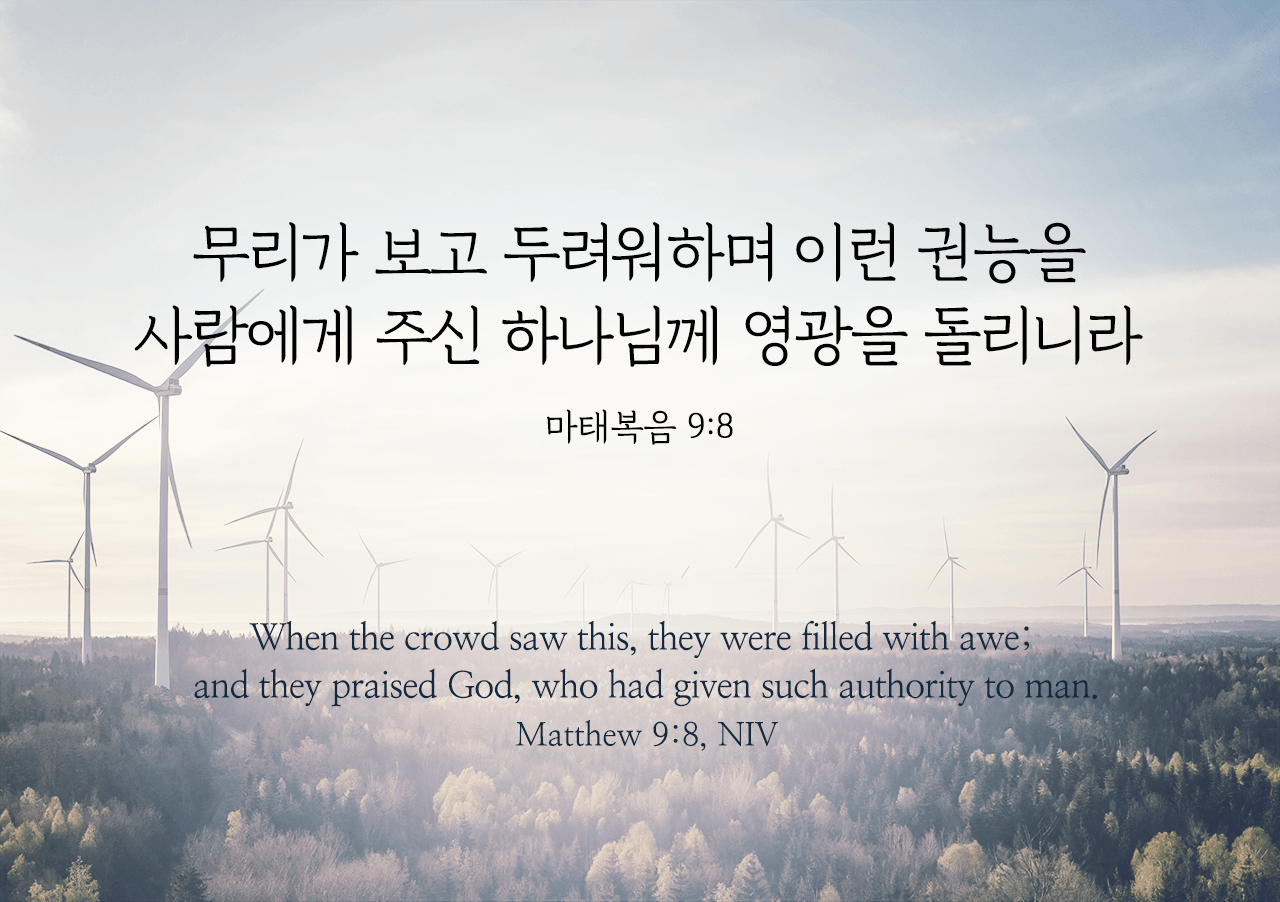 "무리가 보고 두려워하며 이런 권능을 사람에게 주신 하나님께 영광을 돌리니라"