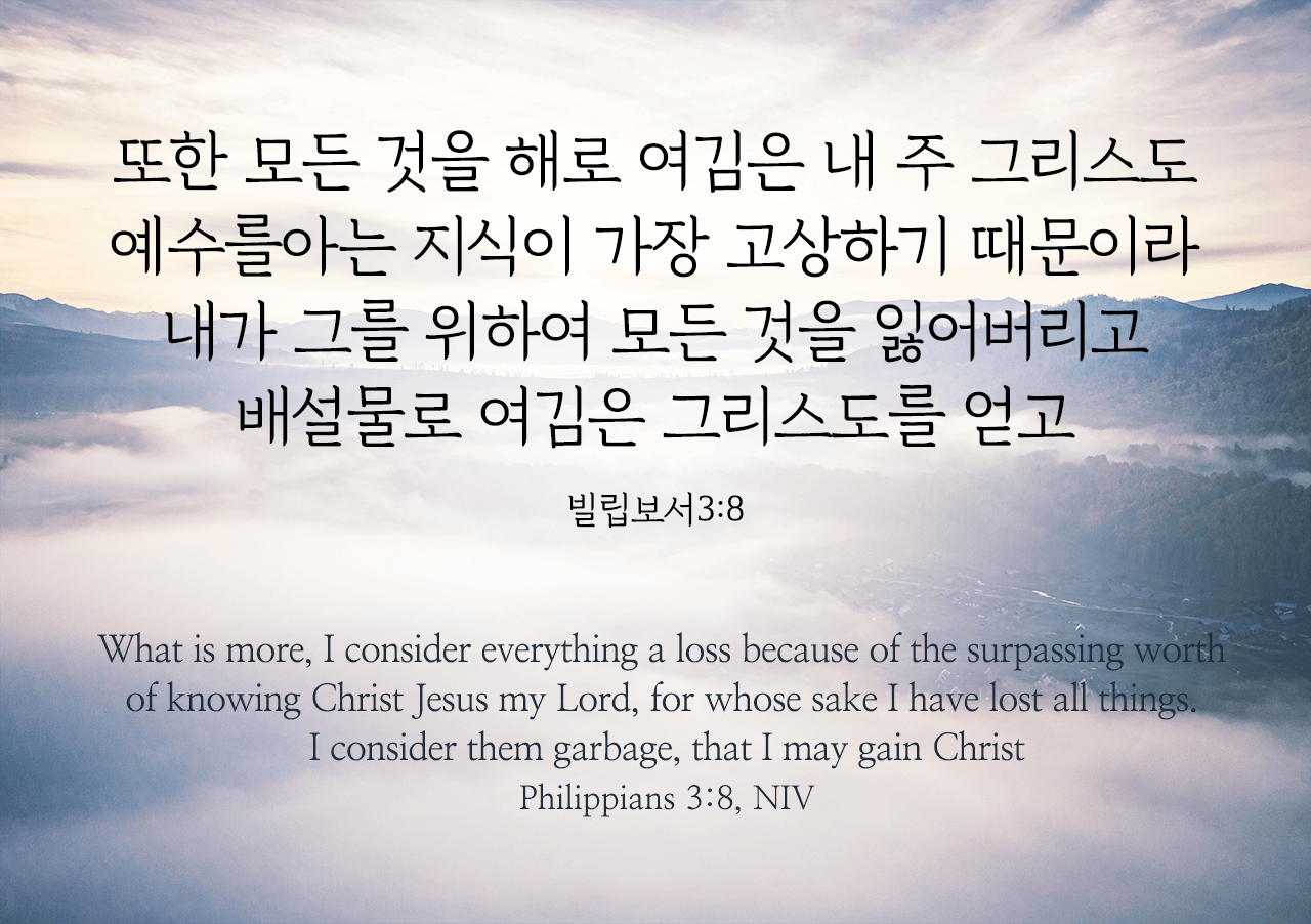 "또한 모든 것을 해로 여김은 내 주 그리스도 예수를 아는 지식이 가장 고상하기 때문이라 내가 그를 위하여 모든 것을 잃어버리고 배설물로 여김은 그리스도를 얻고"