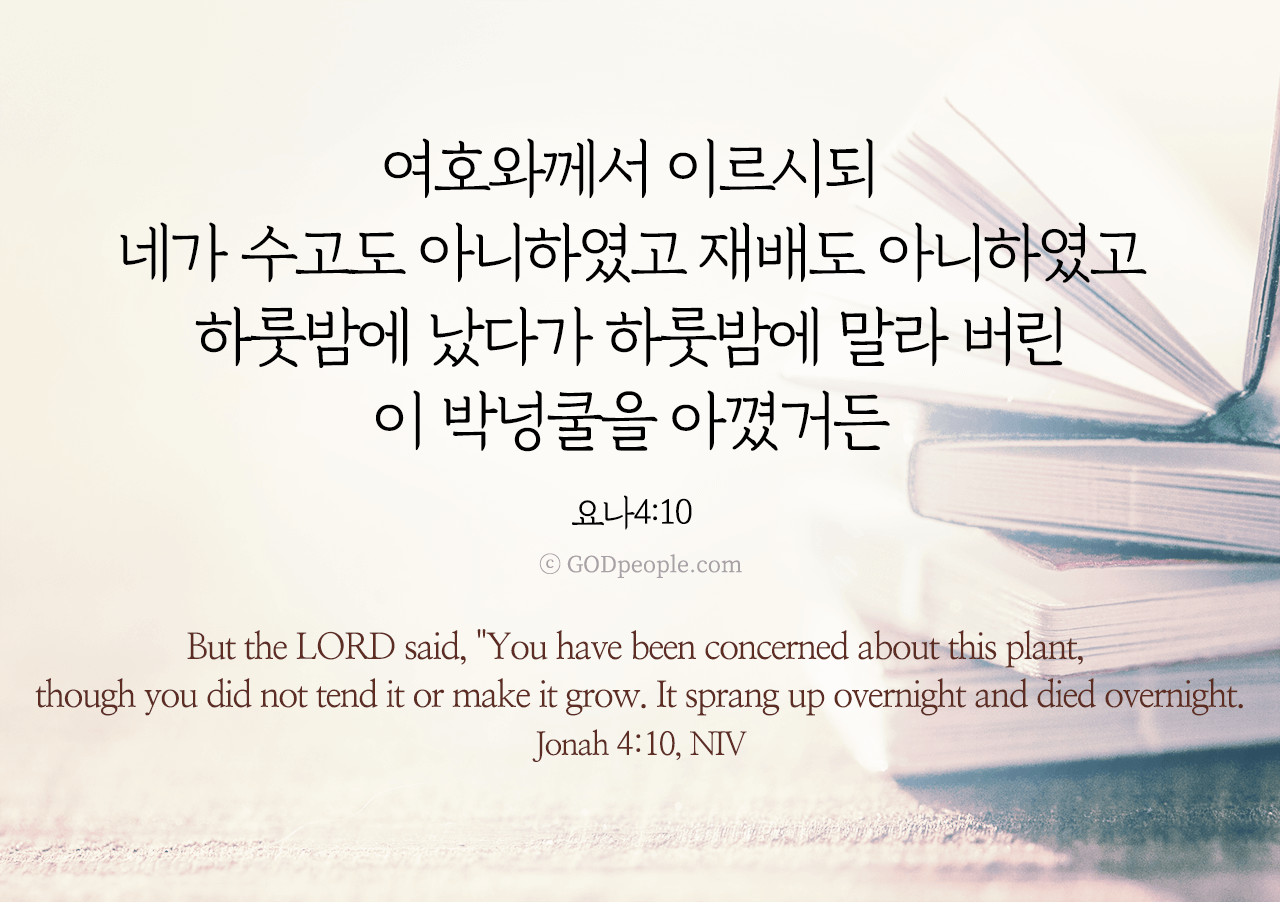 "여호와께서 가라사대 네가 수고도 아니하였고 배양도 아니하였고 하룻밤에 났다가 하룻밤에 망한 이 박 넝쿨을 네가 아꼈거든"