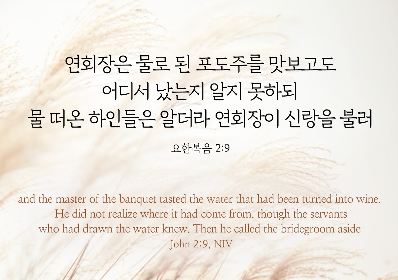 적용: 당신은 주님이 행하신 기적을 알고 있습니까? 그렇다면 그 앎은 자랑이 아니라 섬김으로 표현되어야 합니다. 주님을 경험한 사람은 조용하지만 강한 증인이 됩니다. 오늘 내 삶의 자리에서 말없이 물을 긷고, 순종하며, 영광을 주님께 돌리는 디아코노이가 되시기 바랍니다.
