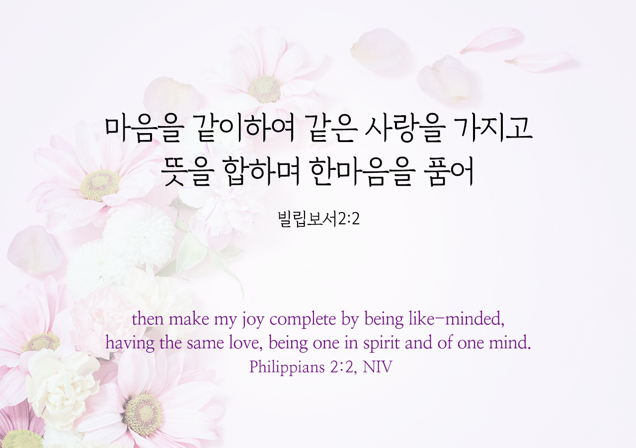 "마음을 같이하여 같은 사랑을 가지고 뜻을 합하며 한마음을 품어 나의 기쁨을 충만하게 하라"