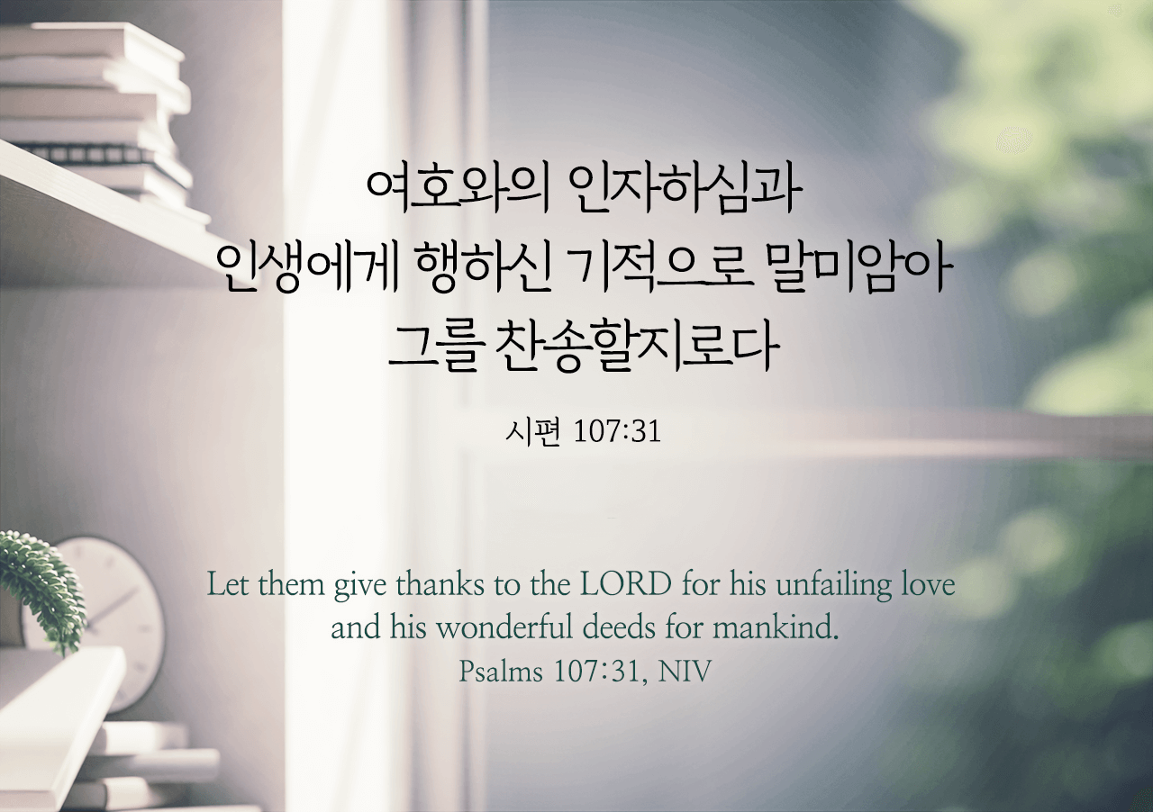 시편 107편 31절은 단 한 절이지만, 그 안에 구원의 역사 전체가 담겨 있습니다. 하나님의 헤세드, 곧 변하지 않는 언약적 사랑이 우리를 광야에서 건지셨고, 죄악의 사슬에서 풀어 주셨으며, 죽음의 문턱에서 일으켜 세우셨습니다. 그 사랑은 어제도, 오늘도, 영원토록 동일하십니다. 우리가 찬송해야 하는 첫 번째 이유는 바로 이 헤세드 안에 있습니다.